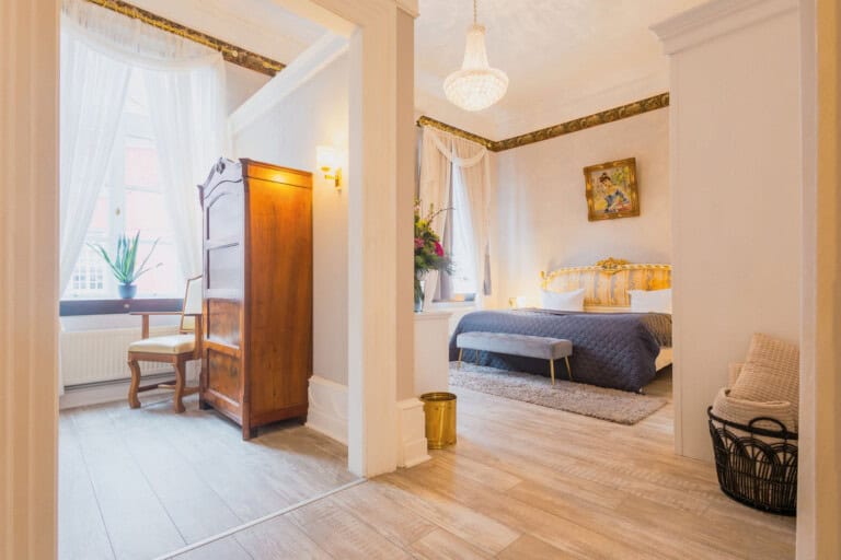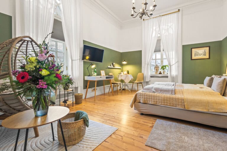 Haselünne selbst ist ein Schatzkästchen: Fachwerkhäuser, das historische Rathaus und die St.-Vincentius-Kirche zeichnen das Stadtbild. Der Berentzen Hof erzählt die Geschichte edler Kornbrennerei, während das Heimatmuseum regionale Kultur lebendig werden lässt. Rund um die Hase locken Kajaktouren, der Haselünner Stausee oder Radwege wie die Emsland-Route und die Hase-Ems-Tour. Wer es außergewöhnlich mag, entdeckt das Schloss Clemenswerth, die Hüvener Mühle oder den Hochseilgarten Dankern – Erlebnisse, die Natur und Kultur miteinander verweben. Wer dann nach einem ausgiebigen Ausflug wieder im Burghotel ankommt, kann sich darauf freuen, in den gemütlichen Zimmern erst einmal die Beine hochzulegen: Die Unterkünfte des Burghotels sind Unikate, individuell gestaltet, modern ausgestattet und stets mit einem Hauch historischer Seele versehen. Ob allein, zu zweit oder mit der Familie – hier entsteht ein Gefühl von Geborgenheit, ohne auf Komfort zu verzichten. Jedes Detail, vom liebevoll gewählten Mobiliar bis zur behutsamen Integration der alten Bausubstanz, spiegelt die Hingabe wider, mit der dieses Haus seit 1979 gewachsen ist.