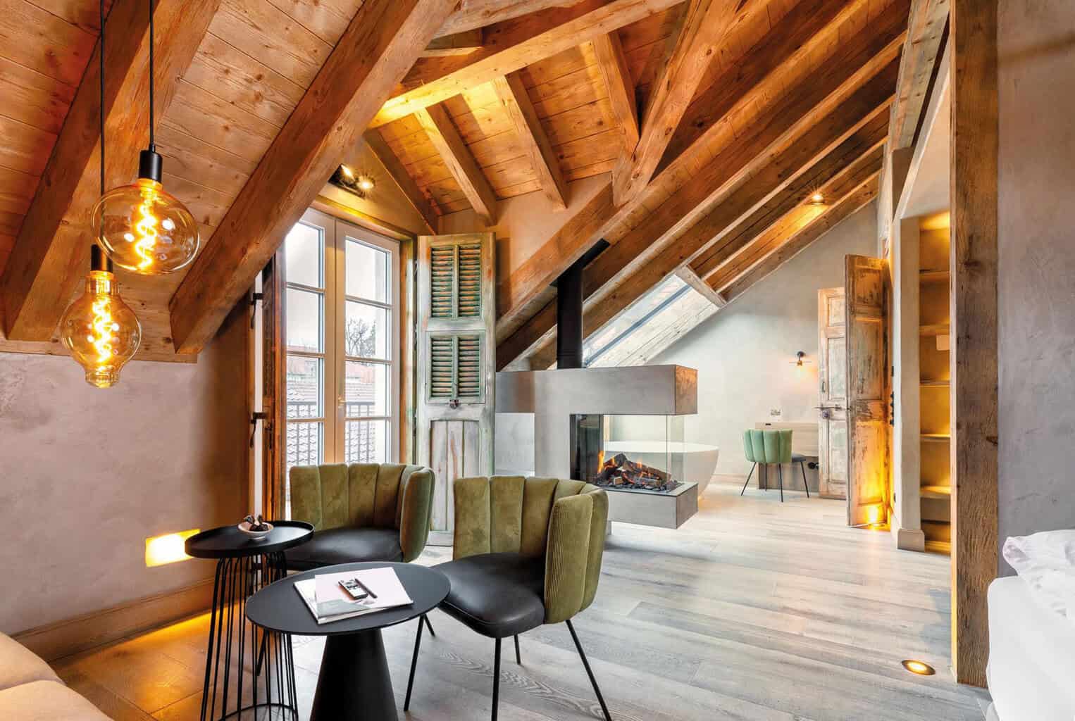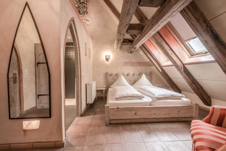 Jedes Zimmer erzählt eine Geschichte und widmet sich historischen Persönlichkeiten wie Wallenstein, Barbarossa oder Galileo Galilei. Liebevoll geschnitzte Möbel, stimmige Beleuchtung und durchdachte Accessoires schaffen Atmosphäre, ohne ins Kitschige abzurutschen. Gleichzeitig bleibt der Komfort zeitgemäß: großzügige Betten, gepflegte Bäder und ausreichend Raum, um sich wirklich auszubreiten.