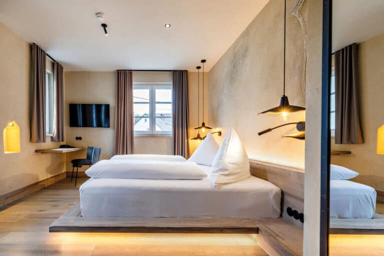 Zwischen schweren Holzbalken und steinernen Details finden sich moderne Bäder, schnelles Internet und ein Service, der aufmerksam und herzlich agiert. Das Arthus wirkt weniger wie eine Kulisse, sondern wie ein stimmiges Gesamtkonzept, in dem Gäste selbst Teil der Inszenierung werden. Familien fühlen sich hier ebenso wohl wie Geschäftsreisende. Die oberschwäbische Umgebung mit ihren Wiesen, Wäldern und barocken Kirchen sorgt zusätzlich für Entschleunigung. Trotz zentraler Lage ist es angenehm ruhig – ideal als Ausgangspunkt für Ausflüge, Radtouren oder berufliche Termine in der Region.