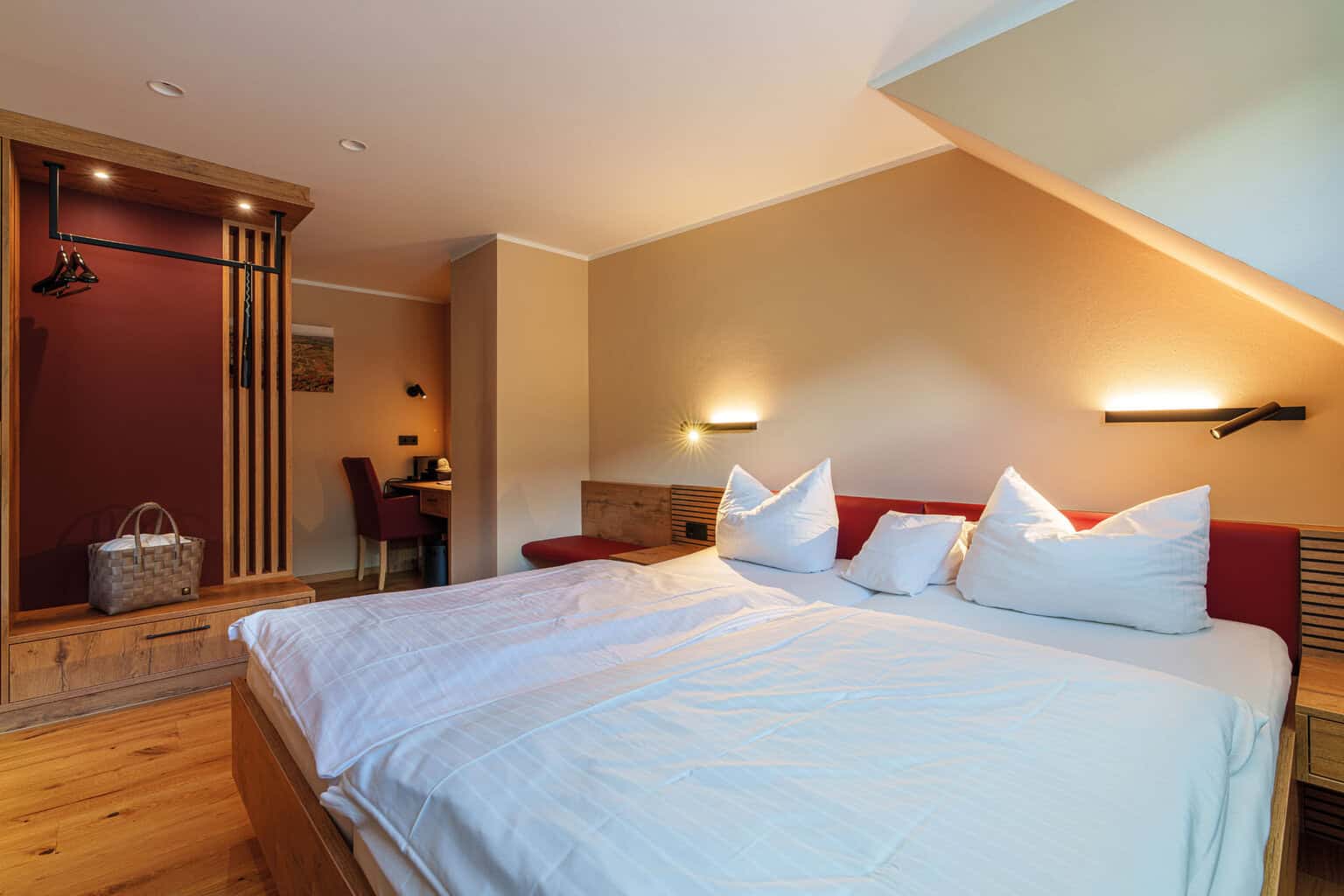 Das Hotel Ruland bietet heute eine breite Auswahl an Unterkünften: vom gemütlichen Zimmer im Stammhaus über das stilvolle Gästehaus bis zu den eleganten Suiten im Brunnenhaus, das mit vier Sternen klassifiziert ist. Insgesamt warten 91 Betten, viele Zimmer mit Balkon und Blick auf die Weinberge oder die felsige Landschaft entlang der Ahr. Barrierefreiheit, Aufzüge und komfortable Ausstattung machen den Aufenthalt für alle Gäste überaus angenehm.