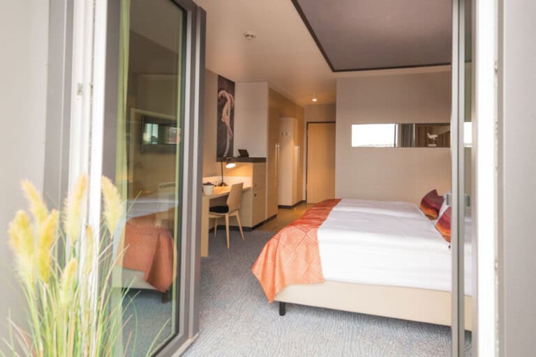 Die Architektur des Hauses greift die Linien eines modernen Hafens auf: klar, hell und offen. Die Zimmer und Suiten sind entsprechend gestaltet – großzügig, stilvoll und mit viel Licht. Fast jedes Zimmer bietet einen Blick aufs Wasser, sei es auf den Hafen, den Binnensee oder die Ostsee. Balkone, große Fenster und hochwertige Materialien sorgen für eine Atmosphäre, die zugleich modern und behaglich wirkt. Besonders hervorzuheben sind die großzügigen Suiten, die mit zusätzlichen Wohnbereichen oder sogar eigener Sauna ein Höchstmaß an Privatsphäre bieten.