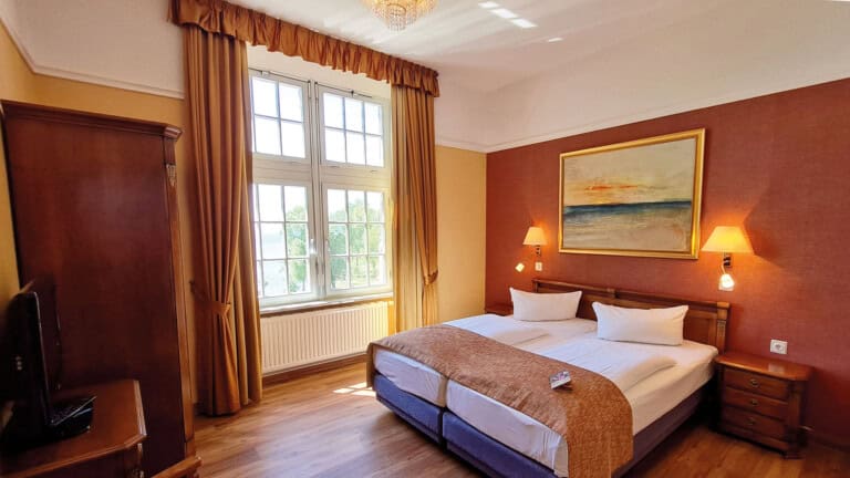 Die Zimmer verteilen sich auf das historische Schloss und die moderne Orangerie. Während im Schloss individuelle Räume mit klassischer Atmosphäre warten, bietet die Orangerie helle Zimmer mit großen Fenstern und teilweise Blick auf die Müritz. Komfortable Betten, moderne Bäder und stilvolle Einrichtung sorgen für einen entspannten Aufenthalt.