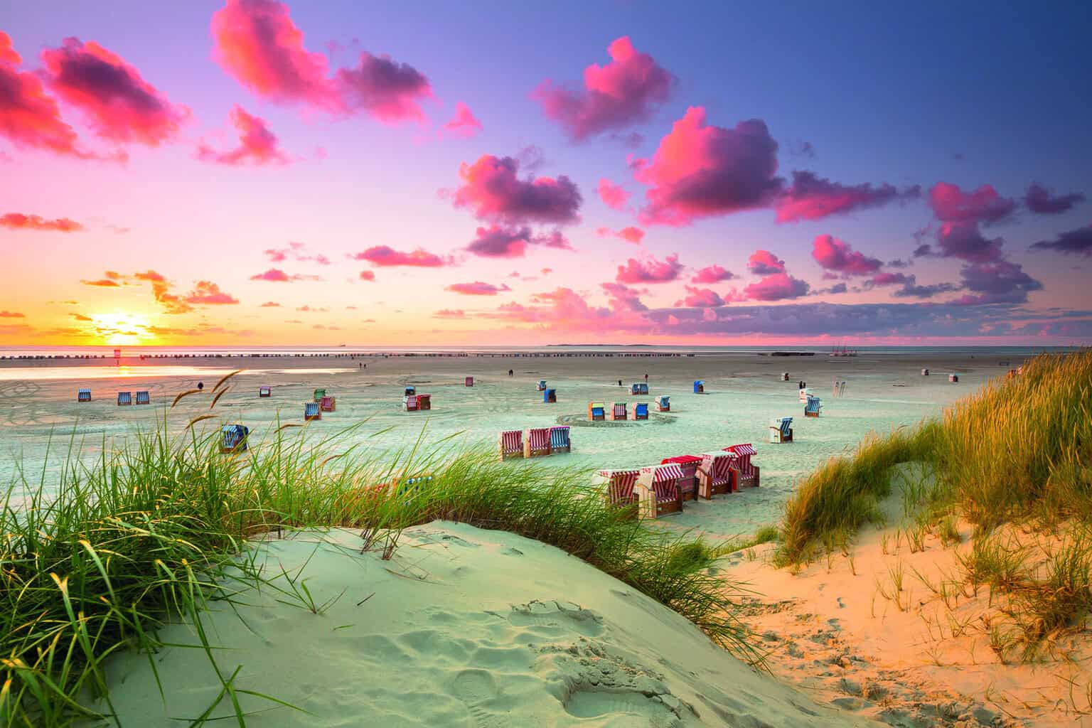 Der Kniepsand ist eine ganz besondere Laune der Natur. Er erstreckt sich von Nord nach Süd über stolze 14 Kilometer; seine breiteste Ausdehnung misst bei Wittdün erstaunliche 2,5 Kilometer. Hier ist der Strand kein „normaler“ Strand, sondern eine imposante, fest mit der Insel verwachsene Sandbank, gespeist aus feinstem, weißem Sand, der Insel umschmeichelnden Nordsee.