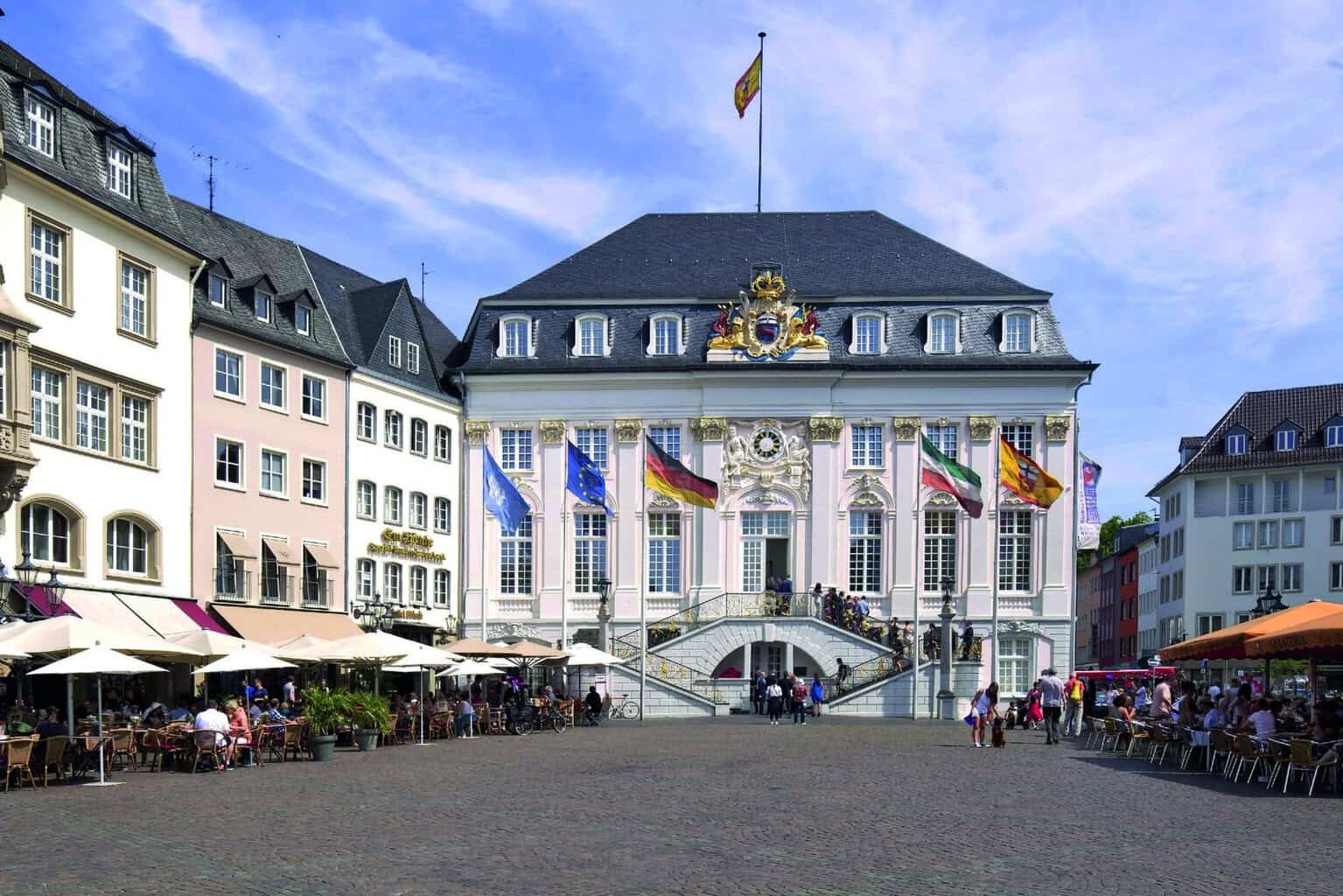 Das eigentliche Herz Bonns liegt wie vor 1500 Jahren rund um das mächtige romanisch-gotische Münster. Nicht weit entfernt steht das Alte Rathaus, vor dessen Rokoko-Fassade sich alltags der Wochenmarkt erstreckt, die aber auch Kulisse für Staatsgäste aus aller Welt und für Hochzeitspaare ist. Ein paar Schritte weiter versetzt das bescheidene Geburtshaus Beethovens den Besucher in die Zeit der Kurfürsten zurück, die ihrerseits großartige Repräsentationsbauten in Bonn zurückgelassen haben. Das Stadtschloss, heute Hauptgebäude der Universität, mit dem prächtigen Hofgarten, und das elegante Lustschloss Clemensruh in Poppelsdorf mit seinem Botanischen Garten rahmen die dicht bebaute Altstadt ein.